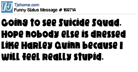 X says Going to see Suicide Squad. Hope nobody else is dressed like Harley Quinn because I will feel really stupid.