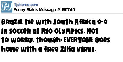X says Brazil tie with South Africa 0-0 in soccer at Rio Olympics. Not to worry, though: EVERYONE goes home with a free Zika virus.