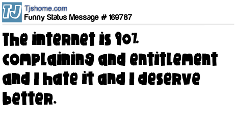 X says The internet is 90% complaining and entitlement and I hate it and I deserve better.