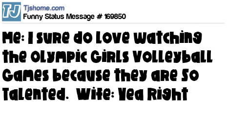 X says Me: I sure do Love watching the Olympic Girls Volleyball Games because they are So Talented. Wife: Yea Right