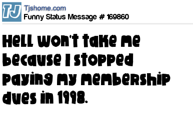 X says Hell won't take me because I stopped paying my membership dues in 1998.