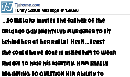 X ... So Hillary invites the father of the Orlando Gay Nightclub murderer to sit behind her at her rally! Heck ... least she could have done is asked him to wear shades to hide his identity. Hmm REALLY BEGINNING TO QUESTION HER Ability to represent America