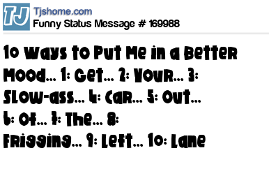 X says 10 Ways to Put Me in a Better Mood... 1: Get... 2: Your... 3: Slow-ass... 4: Car... 5: Out... 6: Of... 7: The... 8: Frigging... 9: Left... 10: Lane