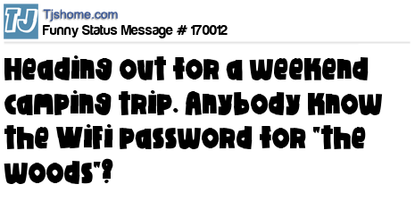 X says Heading out for a weekend camping trip. Anybody know the WiFi password for "the woods"?
