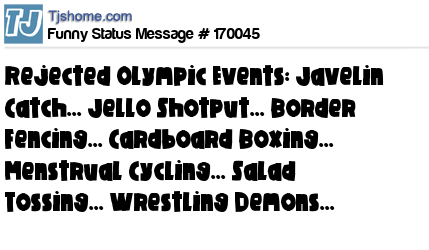 X says Rejected Olympic Events: Javelin Catch... Jello Shotput... Border Fencing... Cardboard Boxing... Menstrual Cycling... Salad Tossing... Wrestling Demons...