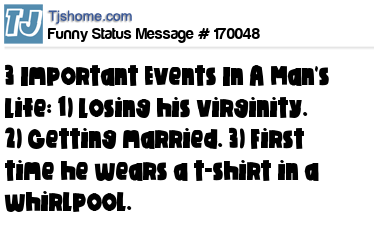 X says 3 Important Events In A Man's Life: 1) Losing his virginity. 2) Getting married. 3) First time he wears a t-shirt in a whirlpool.