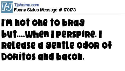 X says I'm not one to brag but....when I perspire, I release a gentle odor of Doritos and bacon.