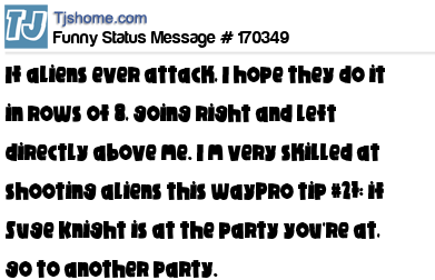 X says If aliens ever attack, I hope they do it in rows of 8, going right and left directly above me. I’m very skilled at shooting aliens this wayPro tip #27: if Suge Knight is at the party you're at, go to another party.