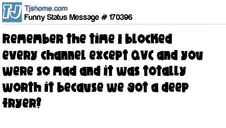 X says Remember the time I blocked every channel except QVC and you were so mad and it was totally worth it because we got a deep fryer?
