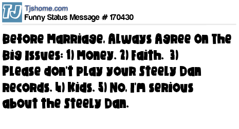 X says Before Marriage, Always Agree On The Big Issues: 1) Money. 2) Faith. 3) Please don't play your Steely Dan records. 4) Kids. 5) No, I'm serious about the Steely Dan.