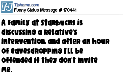 X says A family at Starbucks is discussing a relative's intervention, and after an hour of eavesdropping I'll be offended if they don't invite me.