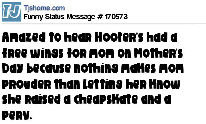 X says Amazed to hear Hooter's had a free wings for mom on Mother's Day because nothing makes mom prouder than letting her know she raised a cheapskate and a perv.