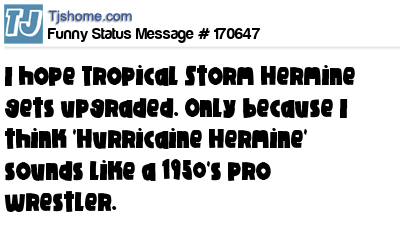 X says I hope Tropical Storm Hermine gets upgraded. Only because I think 'Hurricaine Hermine' sounds like a 1950's pro wrestler.