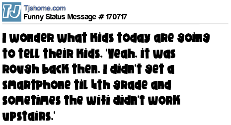 X says I wonder what kids today are going to tell their kids. 'Yeah. it was rough back then. I didn't get a smartphone til 4th grade and sometimes the wifi didn't work upstairs.'