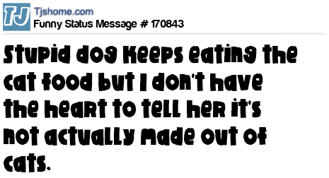 X says Stupid dog keeps eating the cat food but I don't have the heart to tell her it's not actually made out of cats.