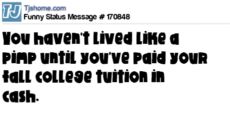 X says You haven't lived like a pimp until you've paid your fall college tuition in cash.