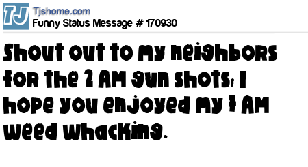 X says Shout out to my neighbors for the 2 AM gun shots; I hope you enjoyed my 7 AM weed whacking.