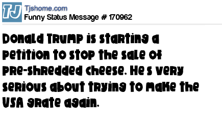X Donald Trump is starting a petition to stop the sale of pre-shredded cheese. He’s very serious about trying to make the USA grate again.