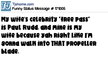 X says My wife's celebrity "free pass" is Paul Rudd, and mine is my wife because yah right like I'm gonna walk into THAT propeller blade.
