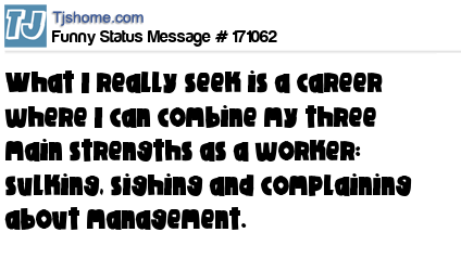 X says What I really seek is a career where I can combine my three main strengths as a worker: sulking, sighing and complaining about management.