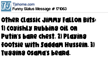 X says Other Classic Jimmy Fallon Bits: 1) Coyishly rubbing oil on Putin's bare chest. 2) Playing footsie with Saddam Hussein. 3) Tugging Osama's beard.