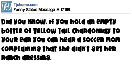 X says Did you know, if you hold an empty bottle of Yellow Tail Chardonnay to your ear you can hear a soccer mom complaining that she didn't get her ranch dressing.