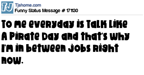 X says To me everyday is Talk Like A Pirate Day and that's why I'm in between jobs right now.