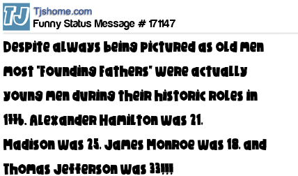 - # 164088 Although the American founding fathers were pictured as old men many were young during their historic roles in 1776. Alexander Hamilton was 21, James Madison 25, James Monroe 18, and Thamas Jefferson was 33!!! Gee, what have I accomplished at those ages?
