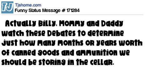 X says Actually Billy, Mommy and Daddy watch these Debates to determine just how many months or years worth of canned goods and ammunition we should be storing in the cellar.