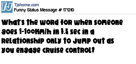 X says What's the word for when someone goes 1-100km/h in 7.5 sec in a relationship only to jump out as you engage cruise control?