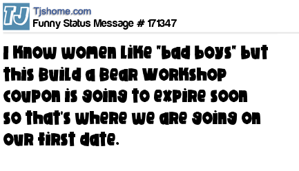 X says I know women like "bad boys" but this Build a Bear Workshop coupon is going to expire soon so that's where we are going on our first date.