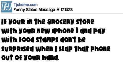 - # 112225 If you're in line at the grocery store with your new iPhone5 and you pull out food stamps, don't be surprised when I slap that phone out of your hand.