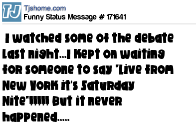 X says I watched some of the debate last night...I kept on waiting for someone to say "Live from New York it's Saturday Nite"!!!!! But it never happened.....