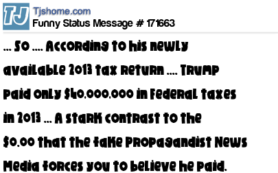 X says ... So .... According to his newly available 2013 tax return .... Trump paid only $40,000,000 in Federal taxes in 2013 ... A stark contrast to the $0.00 that the fake Propagandist News Media forces you to believe he paid.