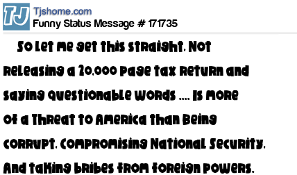 X says So let me get this straight, Not releasing a 20,000 page tax return and saying questionable words .... Is more of a Threat to America than Being corrupt, Compromising National Security, And taking bribes from foreign powers.