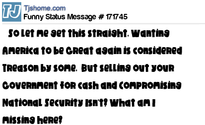 X says So let me get this straight, Wanting America to be Great again is considered Treason by some, But selling out your Government for cash and Compromising National Security Isn't? What am I missing here?