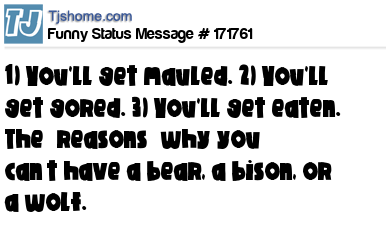 X says 1) You'll get mauled. 2) You'll get gored. 3) You'll get eaten. The “reasons” why you can’t have a bear, a bison, or a wolf.