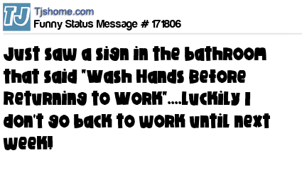 X says Just saw a sign in the bathroom that said "Wash Hands Before Returning to Work"....luckily I don't go back to work until next week!