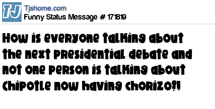X says How is everyone talking about the next presidential debate and not one person is talking about Chipotle now having chorizo?!