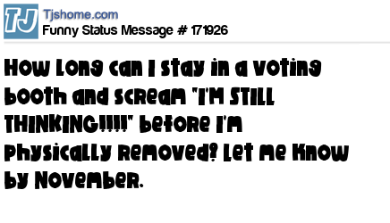 X says How long can I stay in a voting booth and scream "I'M STILL THINKING!!!!" before I'm physically removed? Let me know by November.