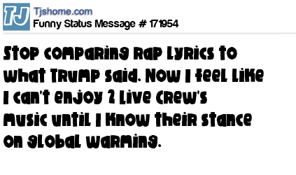 X says Stop comparing rap lyrics to what Trump said. Now I feel like I can't enjoy 2 Live Crew's music until I know their stance on global warming.