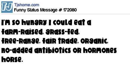 X says I'm so hungry I could eat a farm-raised, grass-fed, free-range, fair trade, organic, no-added antibiotics or hormones horse.