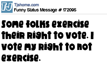 X Some folks exercise their right to vote. I vote my right to not exercise.