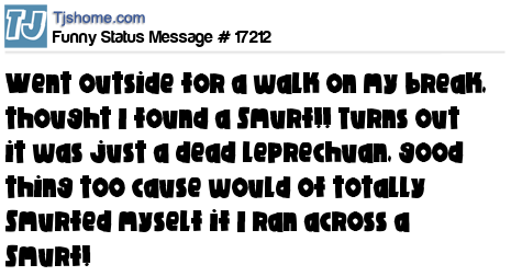 X Went outside for a walk on my break, thought I found a Smurf!! Turns out it was just a dead leprechuan, good thing too cause would of totally Smurfed myself if I ran across a Smurf!