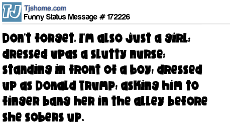 X says don't forget, I'm also just a girl; dressed upas a slutty nurse; standing in front of a boy; dressed up as Donald Trump; asking him to finger bang her in the alley before she sobers up.