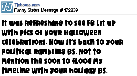 X says It was refreshing to see FB lit up with pics of your Halloween celebrations. Now it's back to your political rambling BS. Not to mention the soon to flood my timeline with your holiday BS.