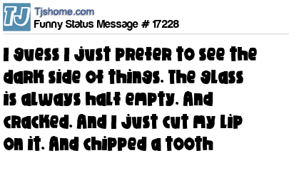 - # 77010 I guess I just prefer to see the dark side of things. The glass is always half empty. And cracked. And I just cut my lip on it. And chipped a tooth.