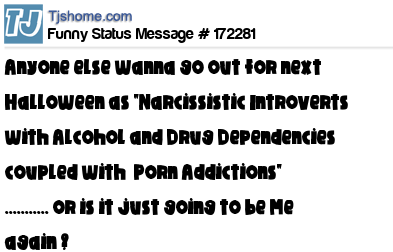 X says Anyone else wanna go out for next Halloween as "Narcissistic Introverts with Alcohol and Drug Dependencies coupled with Porn Addictions" ........... or is it just going to be Me again ?