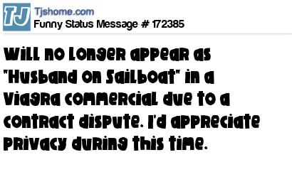 X says Will no longer appear as "Husband on Sailboat" in a Viagra commercial due to a contract dispute. I'd appreciate privacy during this time.
