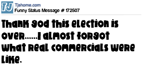 X says Thank god this election is over......I almost forgot what real commercials were like.